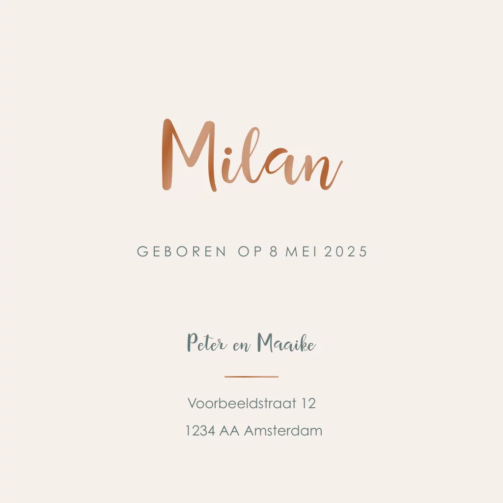 Dit is een clean geboortekaartje voor de geboorte van jullie zoontje. De jungle dieren zijn prachtig geïllustreerd en komen mooi naar voren tegen de lichte achtergrond. De naam van jullie kleintje in hoogglans maakt dit kaartje extra feestelijk. Pas het kaartje naar wens aan in onze online editor!
