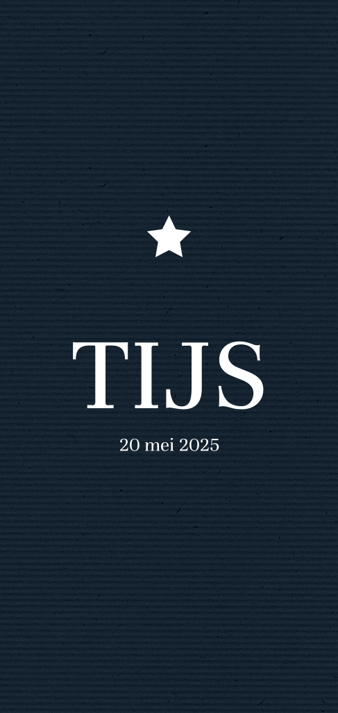 Kondig de geboorte van jullie zoontje aan met dit mooie kaartje. Het kaartje heeft een donkerblauwe gestreepte achtergrond. Het sterretje boven de naam wordt gedrukt in goudfolie en geeft dit kaartje een luxe uitstraling. Pas het kaartje naar wens aan in onze online editor!