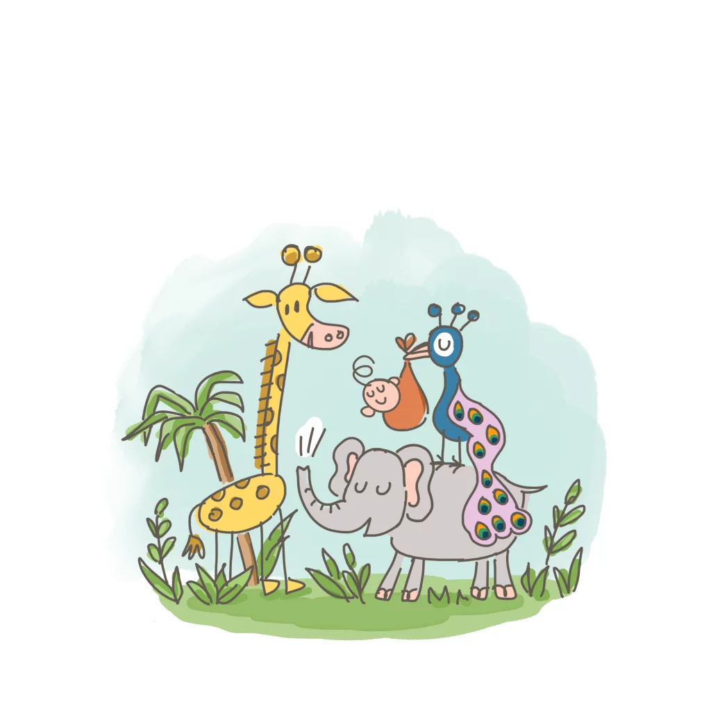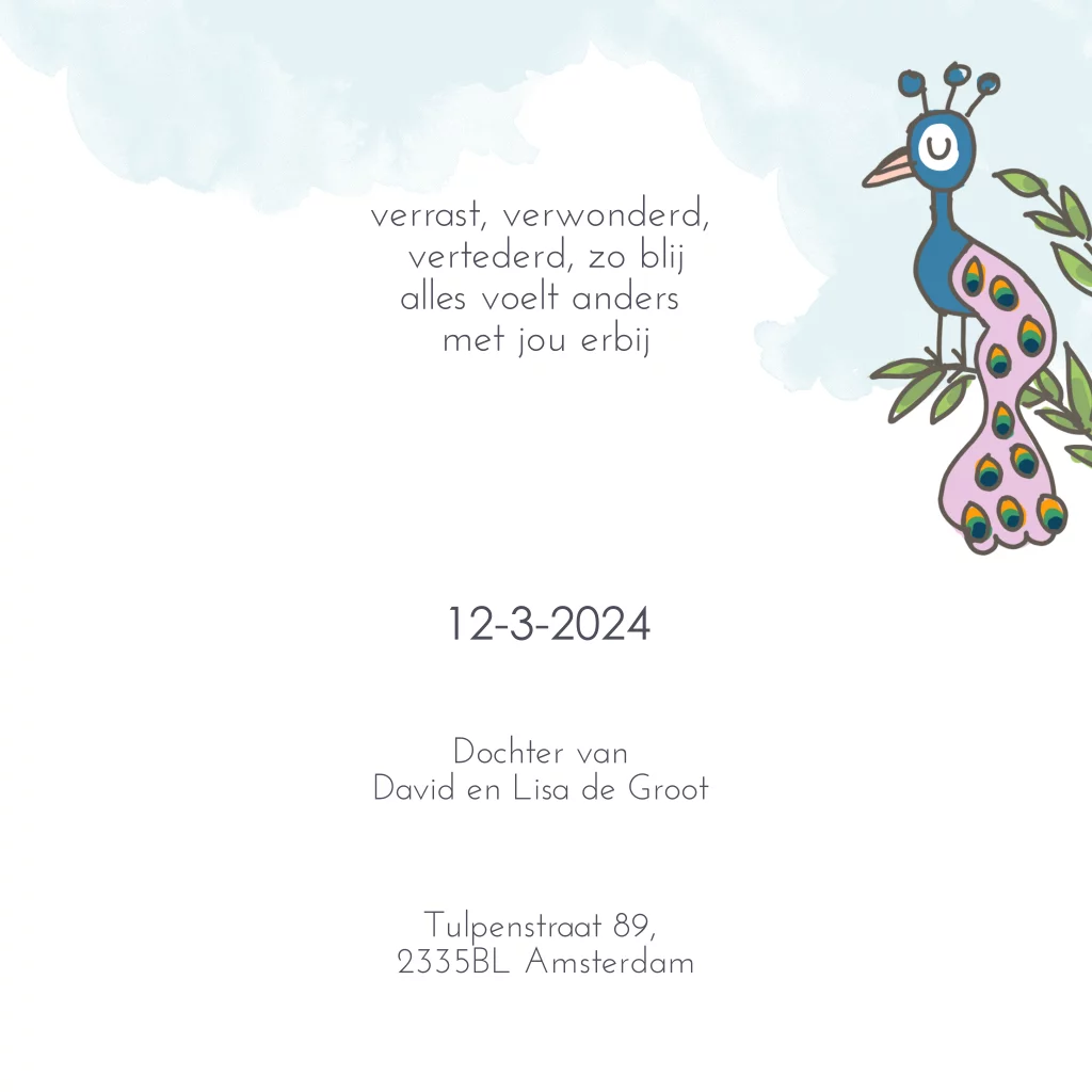 Dit vrolijke babykaartje is leuk voor zowel een jongen als een meisje. De pauw met kindje poseert op de rug van de olifant. De naam wordt gedrukt in goudfolie en de lichtblauwe waterverf achtergrond maakt dit kaartje helemaal af. Bestel snel een proefdruk om dit kaartje in het echt te zien!