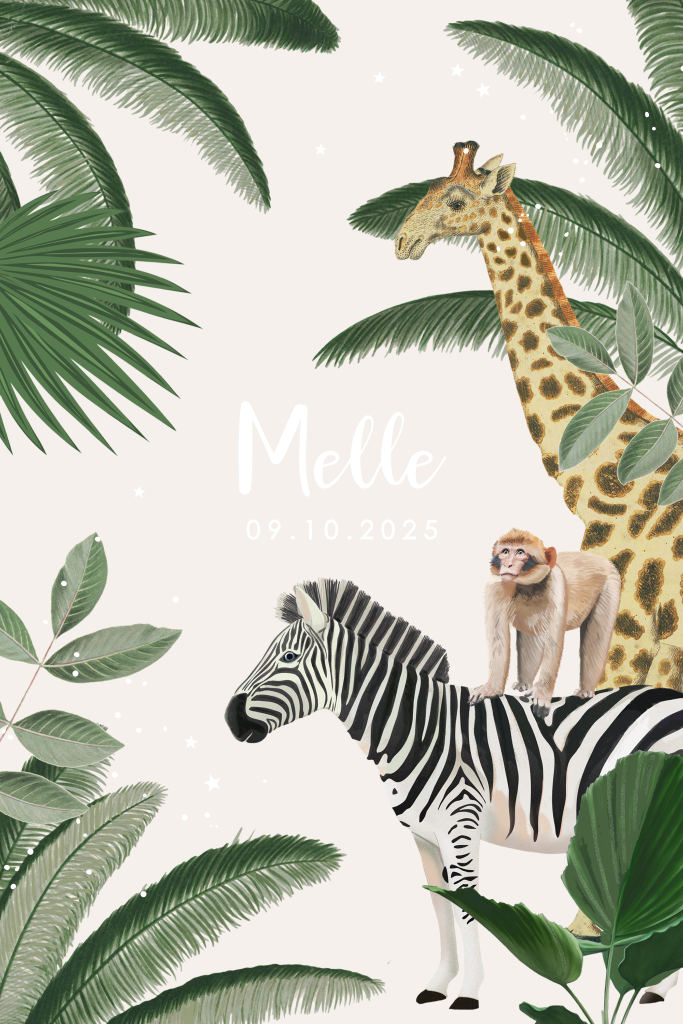 Kondig de geboorte van jullie zoontje aan met dit feestelijke kaartje! Een giraffe, zebra en aap nemen een kijkje om het hoekje en zijn geïllustreerd in de jungle. De goudfolie typografie en goudfolie spetters maken dit kaartje helemaal compleet. Bestel snel een proefdruk om dit kaartje in het echt te zien!