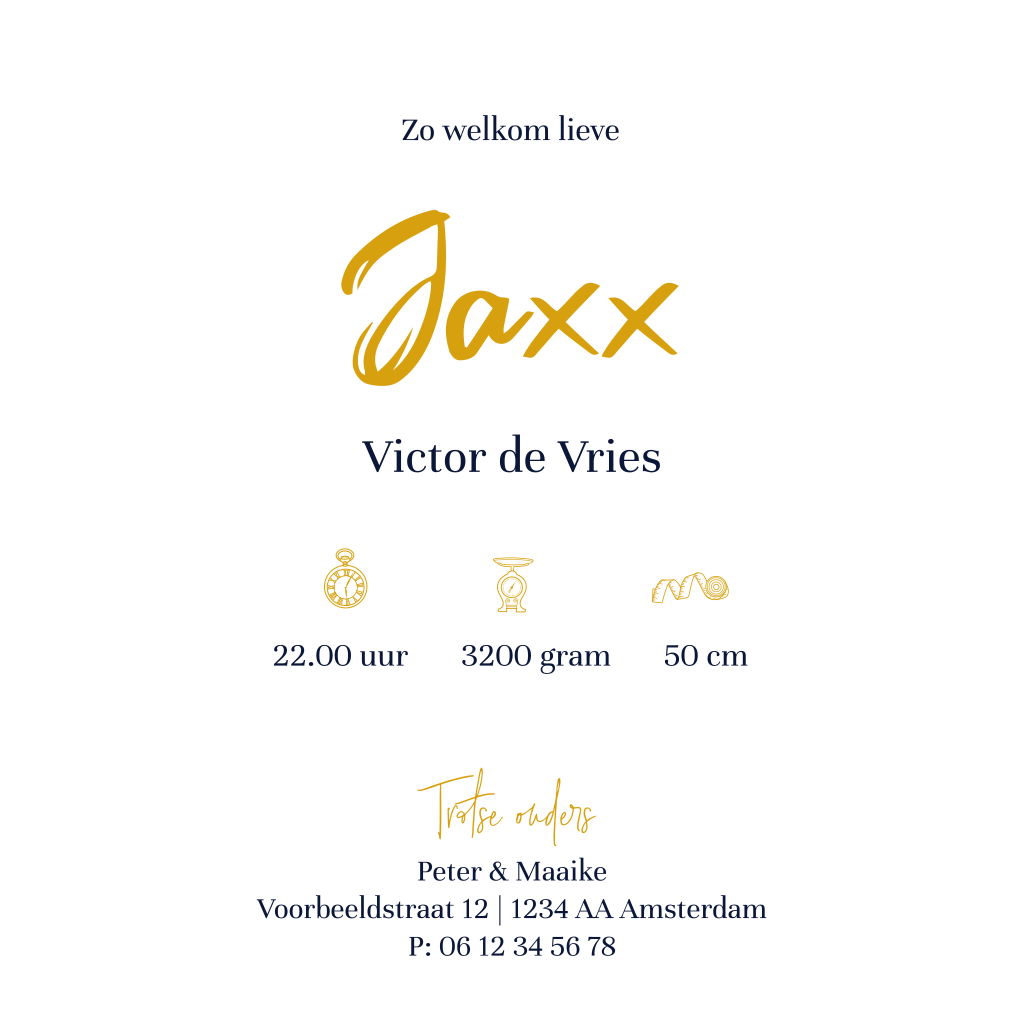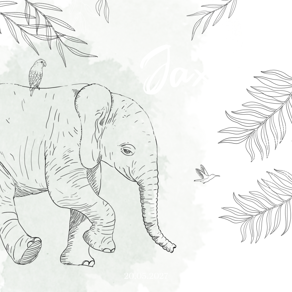 Dit is een uniek kaartje voor jullie pasgeboren zoontje. Op de groene watercolour achtergrond staat de lijntekening van een olifant. De goudfolie typografie maakt dit kaartje extra bijzonder. Bestel snel een proefdruk om dit kaartje in het echt te bewonderen!