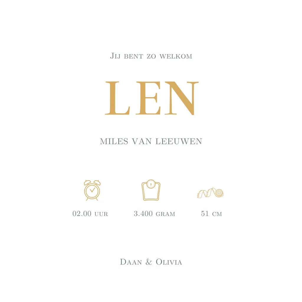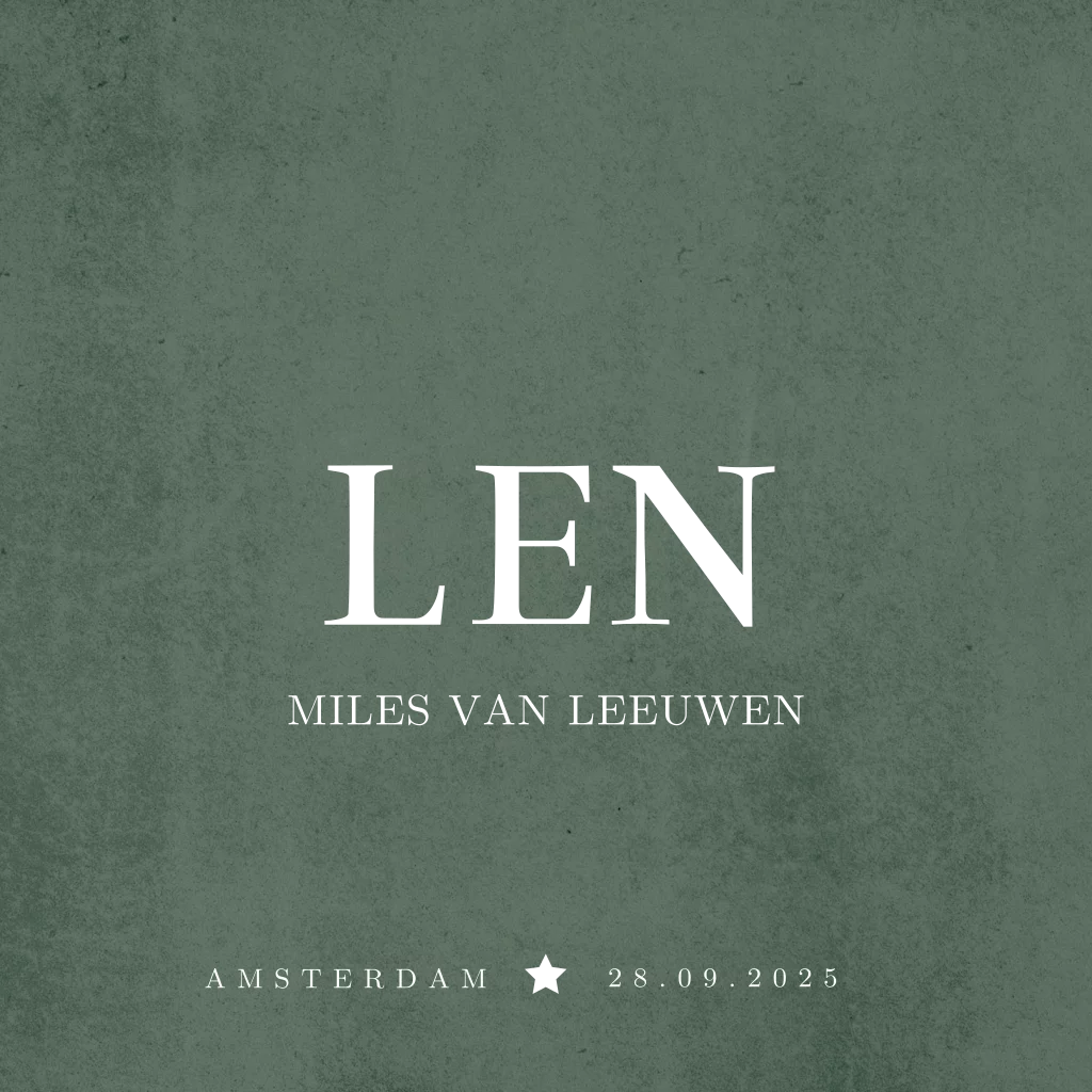 Kondig de geboorte van jullie zoontje aan met deze stoere kaart! Het kaartje heeft een groene velvet-look achtergrond. De naam wordt gedrukt in goudfolie. Pas het kaartje naar wens aan in onze online editor en bestel snel een proefdruk om dit kaartje in het echt te zien!
