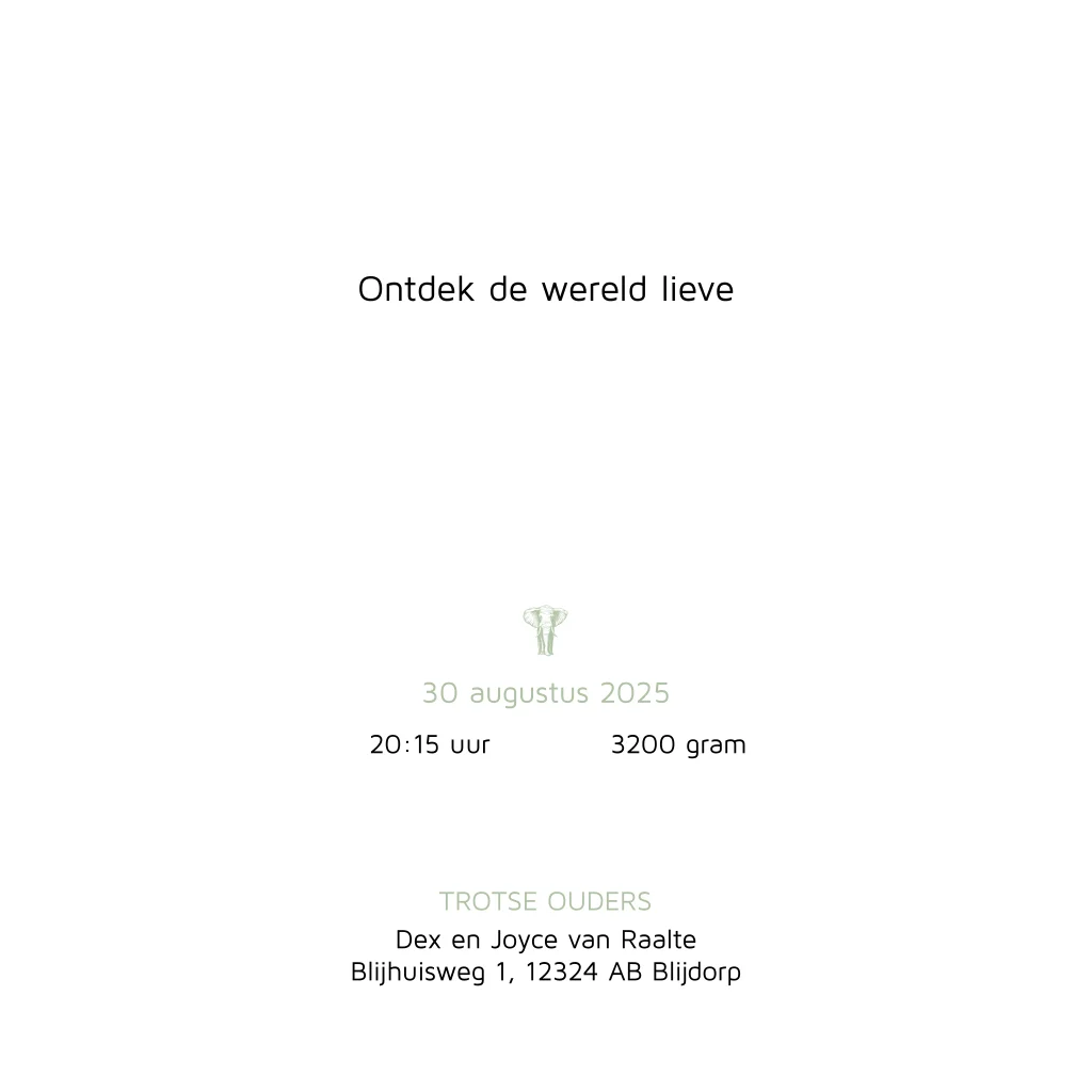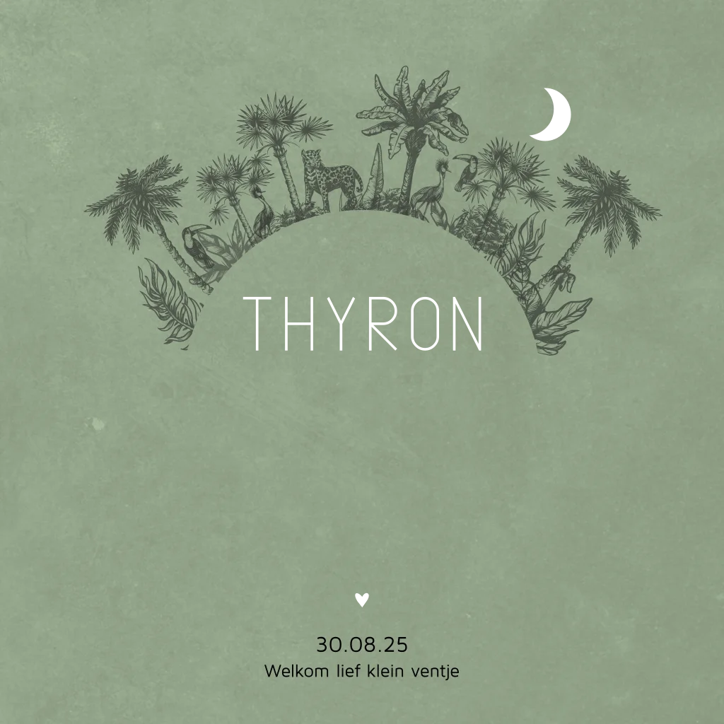 Kondig de geboorte van jullie zoontje aan met dit luxe kaartje! Het kaartje heeft een groene achtergrond en een tekening van jungle dieren in een halve cirkel. De naam van jullie kleintje en het maantje worden gedrukt in goudfolie. Bestel snel een proefdruk om dit kaartje in het echt te bewonderen!