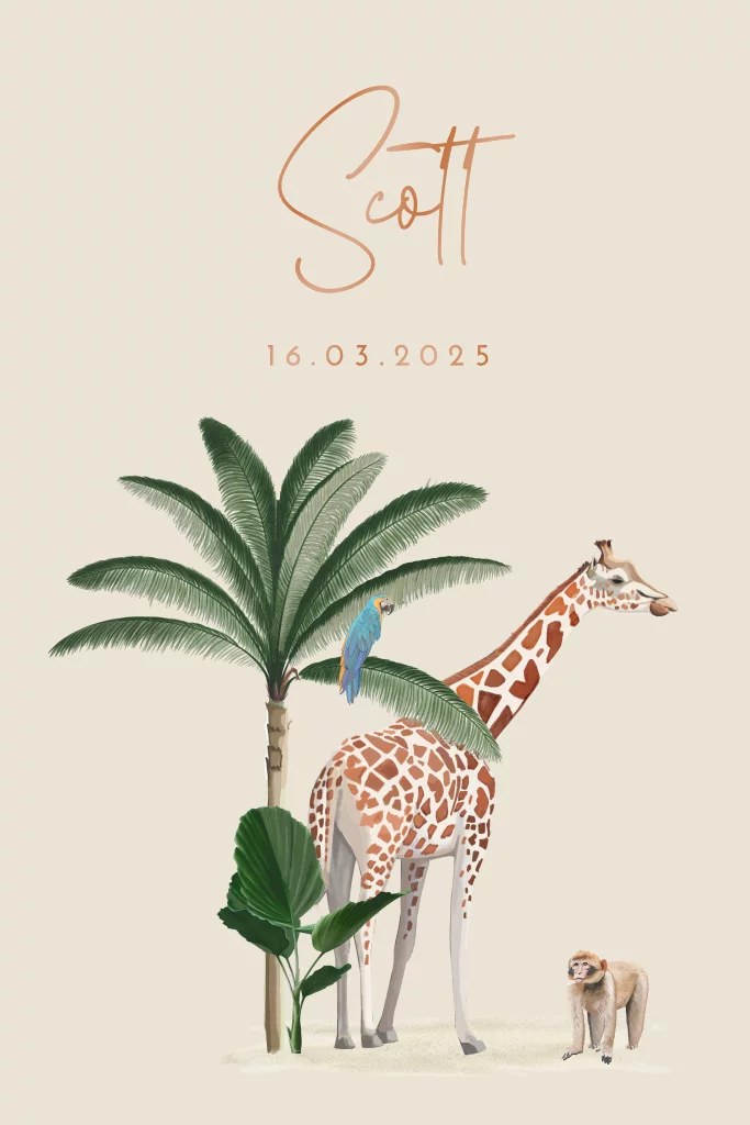 Hip en luxe. De giraffe, papegaai en aap zijn prachtig geïllustreerd tegen de lichte achtergrond. De hoogglans typografie en ronde hoekjes maken dit kaartje helemaal compleet. Bestel snel een proefdruk om dit kaartje in het echt te bewonderen!