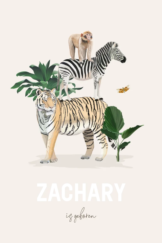 Kondig de geboorte van jullie zoontje aan met dit prachtige kaartje! Op het kaartje zijn een aantal jungle dieren geïllustreerd die prachtig naar voren komen tegen de lichte achtergrond. De naam van jullie kleintje in goudfolie geeft dit kaartje een luxe uitstraling. Bestel snel een proefdruk om dit kaartje in het echt te zien!