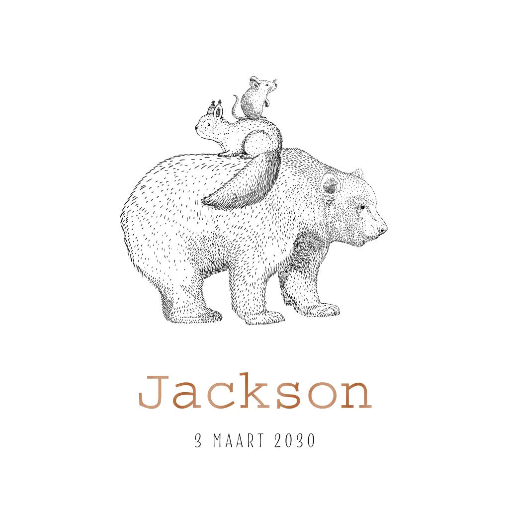 Kondig de geboorte van jullie zoontje aan met dit stoere kaartje. Op het kaartje staan de tekeningen van een beer, eekhoorn en muis. De naam wordt gedrukt in hoogglans. Pas het kaartje naar wens aan in onze online editor en bestel snel een proefdruk om dit kaartje in het echt te zien!