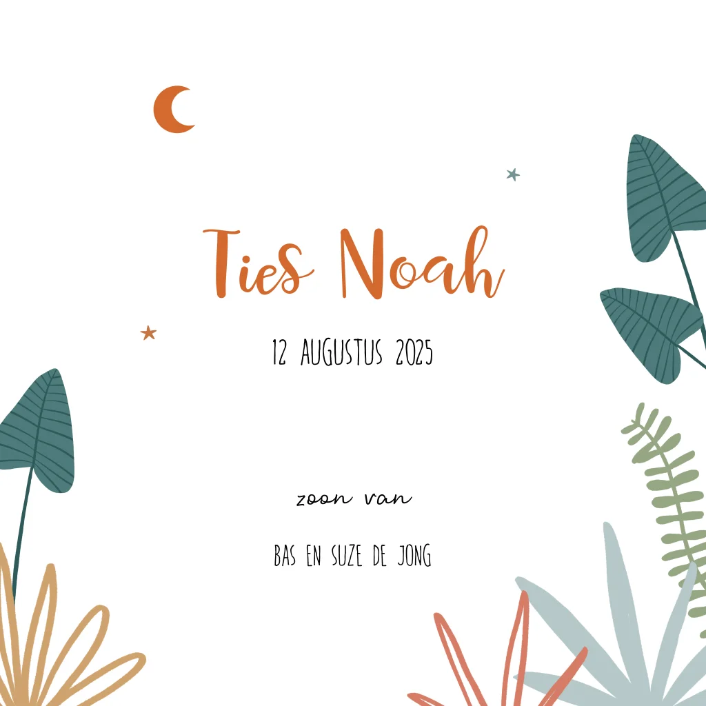 Dit is een uniek geboortekaartje met jungledieren voor een jongen. De naam in hoogglans en hoogglans details geven dit kaartje een luxe uitstraling. Pas het kaartje aan in de online editor en bestel snel een proefdruk om dit kaartje in het echt te zien!