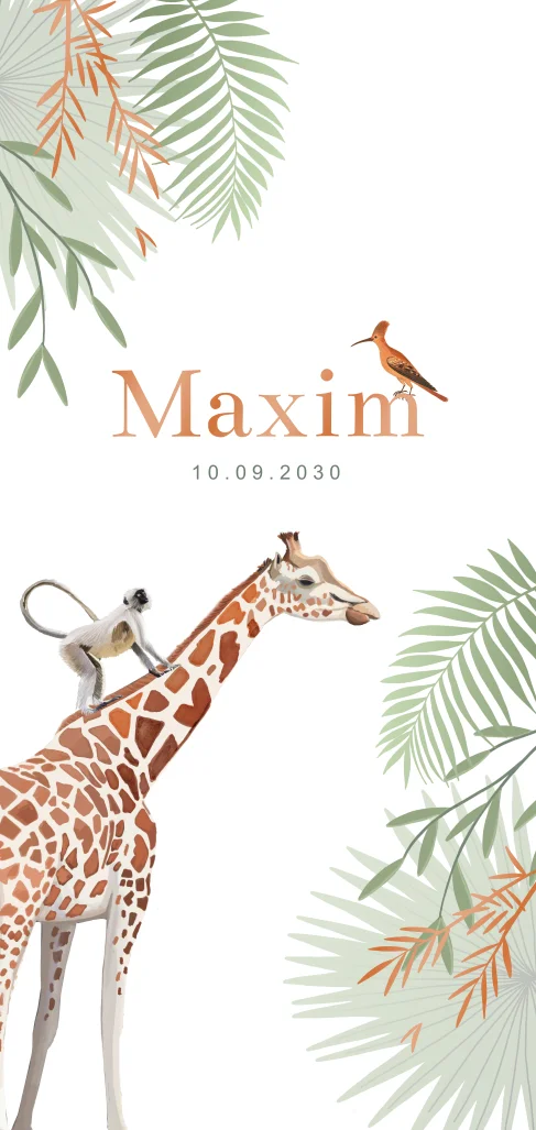 Kondig de geboorte van jullie kleine jongen aan met dit stoere kaartje! De illustratie van de giraffe met aapjes is prachtig. De groene jungle bladeren met hoogglans details maken dit kaartje helemaal compleet. Bestel snel een proefdruk om dit kaartje in het echt te zien!