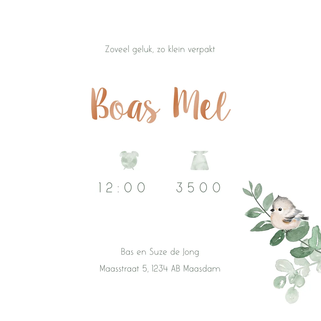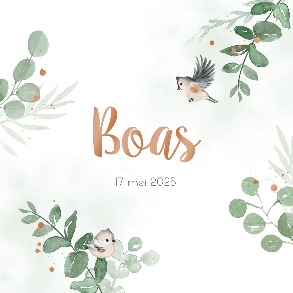 Dit is een prachtig kaartje voor jullie pasgeboren zoontje. Op het kaartje zijn groene takjes en twee vogeltjes te zien. De naam in hoogglans en hoogglans details maken dit kaartje helemaal af. Bestel snel een proefdruk om dit kaartje in het echt te bewonderen!