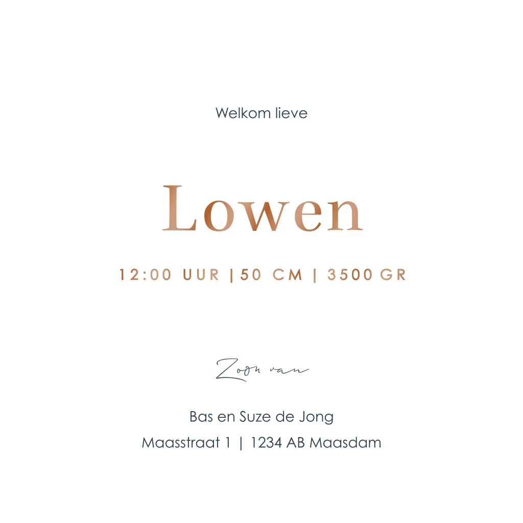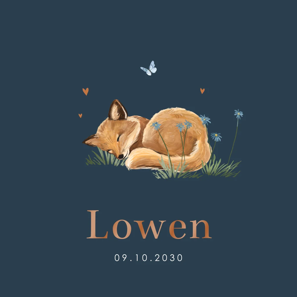Kondig de geboorte van jullie zoontje aan met dit lieve kaartje. De illustratie van een slapende vos in het gras is prachtig. De hoogglans naam en hartjes maken dit kaartje helemaal compleet. Pas het kaartje naar wens aan in onze online editor en bestel snel een proefdruk om dit kaartje in het echt te zien!