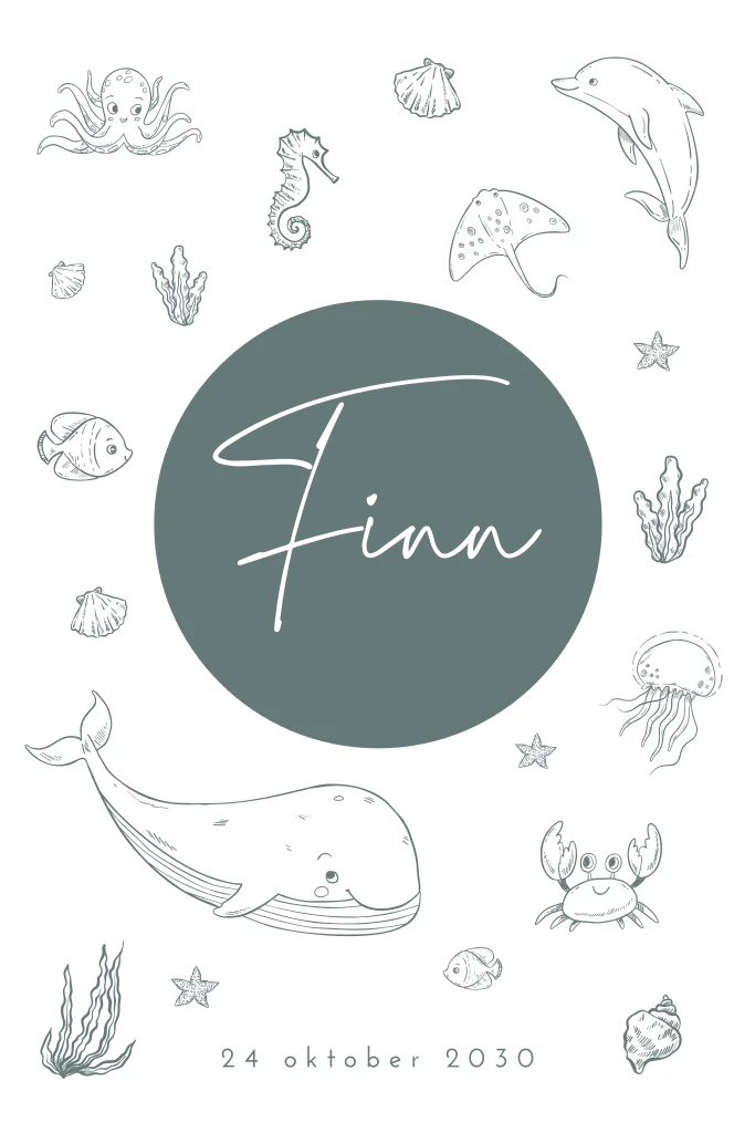 Dit is een prachtig onderwaterwereld kaartje voor jullie pasgeboren zoontje. Op het kaartje zijn verschillende zeedieren getekend. De naam in goudfolie komt mooi naar voren tegen de donkere naamcirkel.