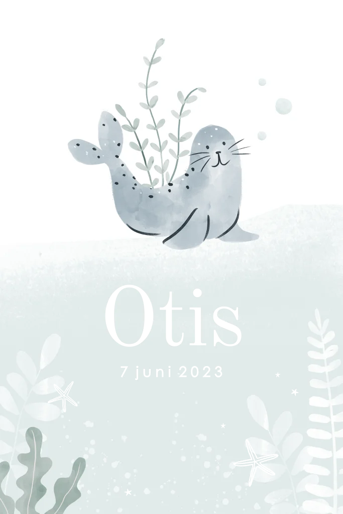 Op dit hippe babykaartje voor je zoontje is een zeeleeuw getekend met onderwaterwereld. De naam, geboortedatum en zeesterren worden in goudfolie gedrukt.