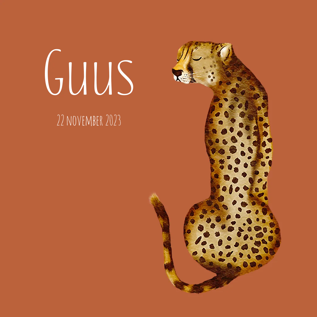 Dit is een avontuurlijk en hip design om de geboorte van je zoontje aan te kondigen. De stoere panter staat centraal tegen een rode achtergrond. De zwart folie typografie past helemaal bij het geheel. Pas het kaartje aan in de online editor en bestel een proefdruk om het kaartje in het echt te zien!