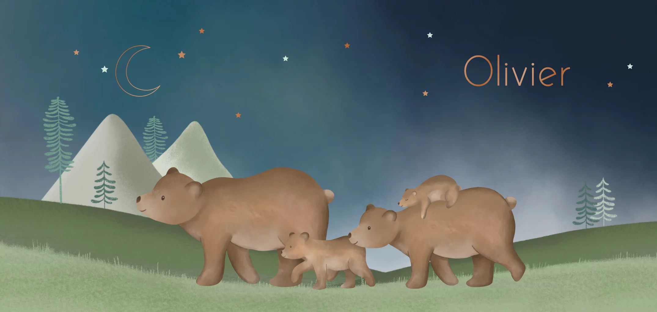 Een prachtig hoogglans geboortekaartje voor een broertje. Op het kaartje zie je een familie van beren lopend onder de sterrenhemel.