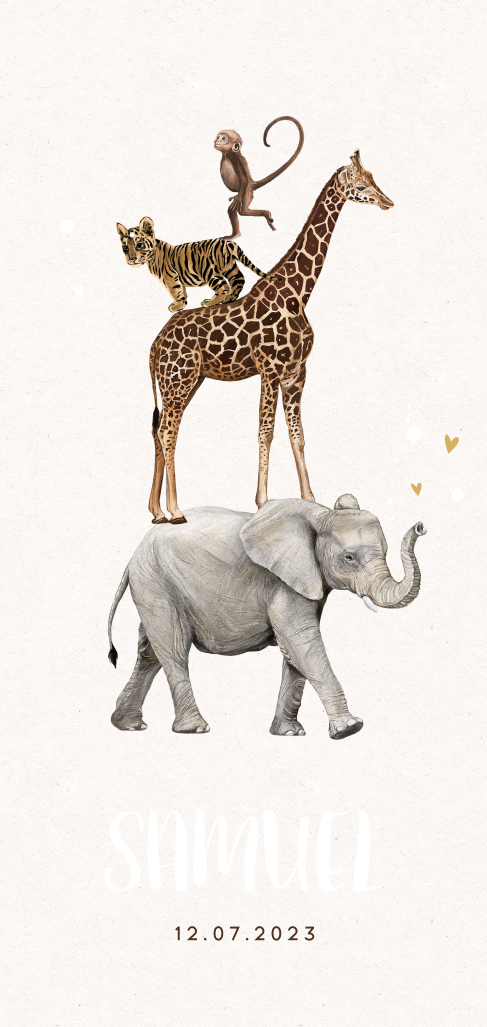 Een stoer goudfolie geboortekaartje voor de geboorte van jullie zoontje. Op dit langwerpige exemplaar zijn gestapelde dieren te zien. Een olifant, giraffe, tijger en een aapje. De naam in goudfolie maakt dit ontwerp helemaal af.