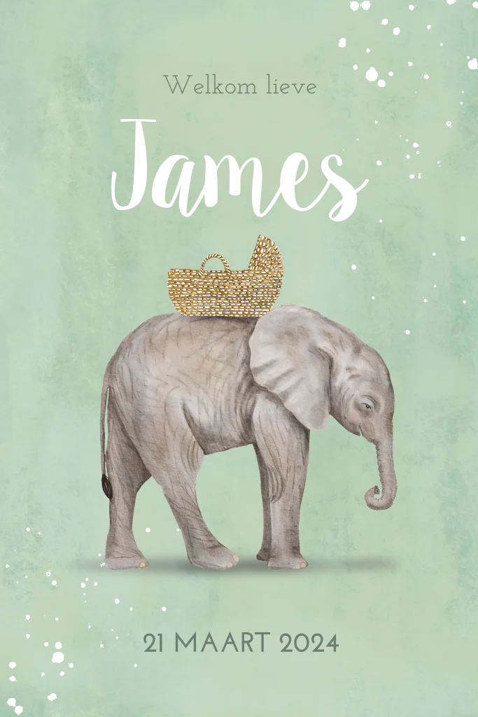 Op dit lieve babykaartje staat de tekening van een olifantje met een wiegje op zijn rug op een handgeschilderde mintgroene achtergrond. De goudfolie accenten maken dit kaartje compleet. Bestel snel een proefdruk om dit kaartje in het echt te bewonderen!