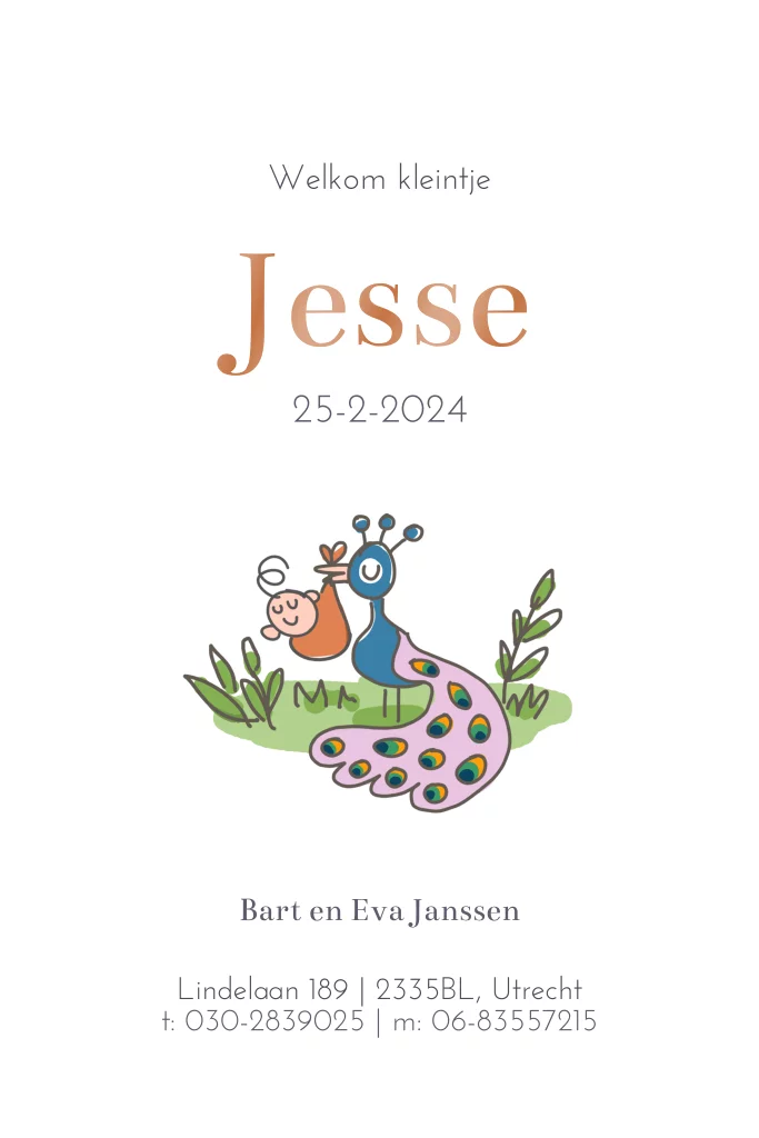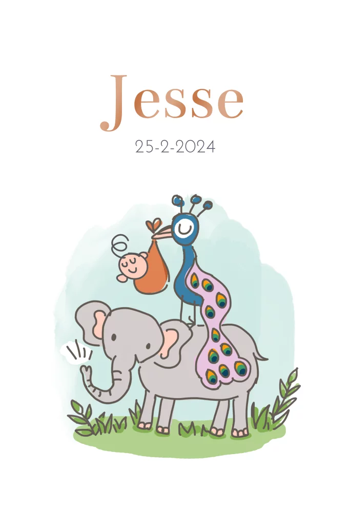 Lief hoogglans geboortekaartje met pauw, olifant en baby
