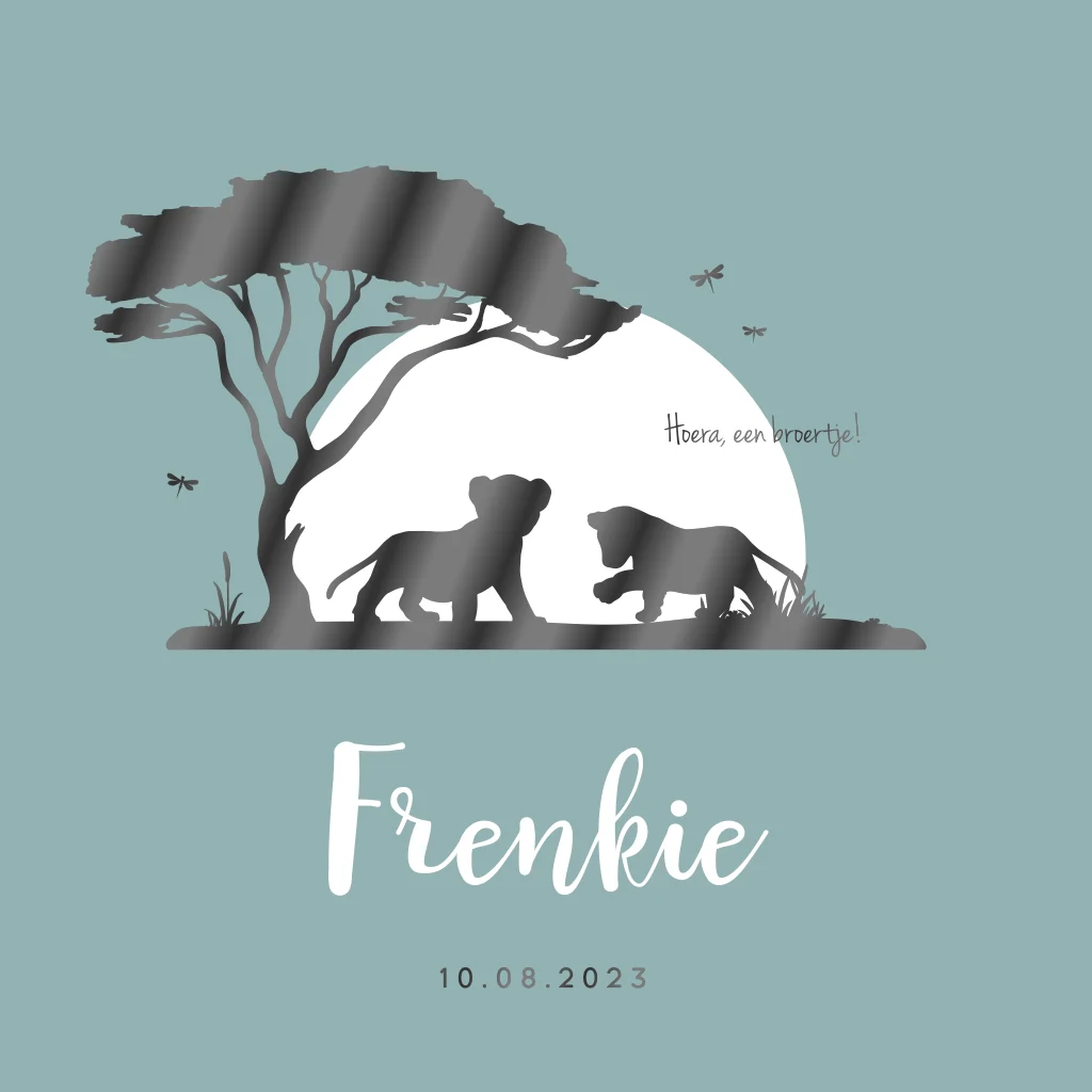 Stoer zwart folie geboortekaartje voor een jongetje met een landschap en de silhouetjes van twee leeuwen broertjes. Dit kaartje ziet er daardoor erg avontuurlijk uit. Verwachten jullie je tweede kindje? Dan is dit een hele goede optie!