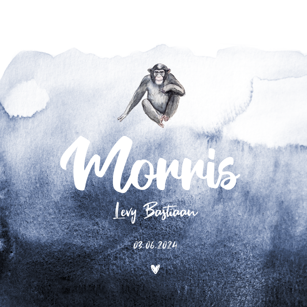 Geboortekaartje voor jongen met een stoere aap met aquarel geschilderd. Maak er, met de juiste kleuren en lettertypes, je eigen ontwerp van. De naam en details in goudfolie zorgen voor een luxe afwerking.