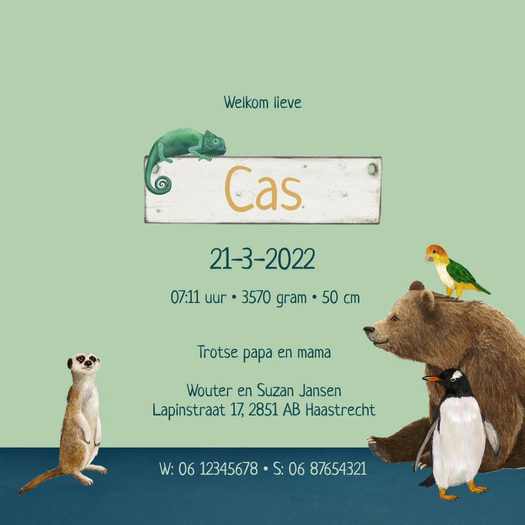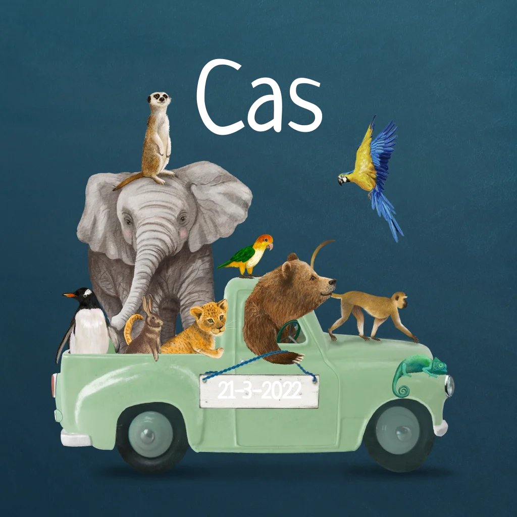 Speels dierengeboortekaartje met deze pick up auto met een beer, olifant, aapje, leeuw en papegaaien. Pas gemakkelijk zelf de verschillende elementen aan, zoals de naam en geboortedatum. Het goudfolie maakt het helemaal af.