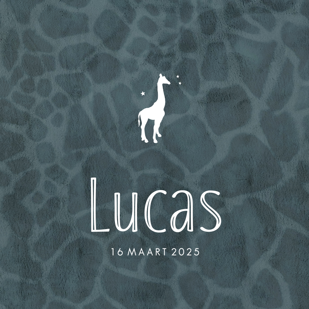 Op dit hippe babykaartje staan het silhouet van een girafje en een print van giraf vlekken. De goudfolie accenten staan in mooi contrast met de blauwe velvet-look achtergrond. Wijzig de teksten en eventueel kleuren gemakkelijk in de online editor.