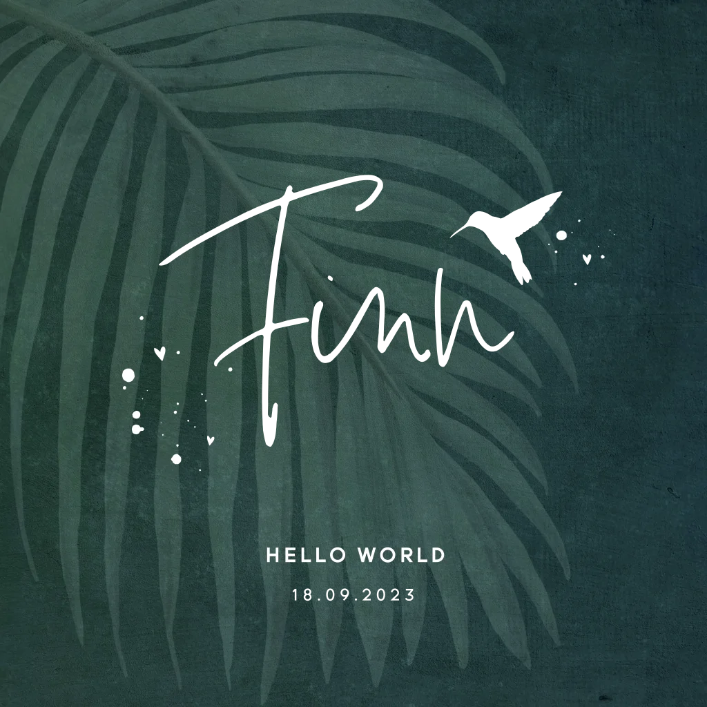 Een stijlvol geboortekaartje voor jullie zoon. Deze kaart heeft een donkergroene achtergrond met de tekening van een blad. De aandacht gaat meteen naar de goudfolie naam in het midden. Hier is ook een lieve kolibrie bij geplaatst.