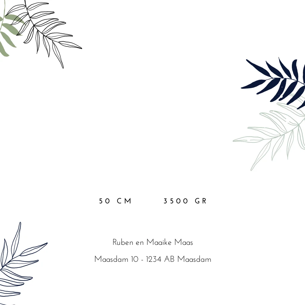 Een avontuurlijk kaartje voor de geboorte van jullie zoontje. Deze geboortekaart, met een witte achtergrond, heeft langs de zijkanten stijlvolle bladeren in verschillende kleuren. In het midden zijn een welpje, giraffe en een olifantje te zien. Deze gave dieren worden, net als de naam van jullie kindje, gedrukt in in goudfolie. Dit geeft de kaart een luxe uitstraling.