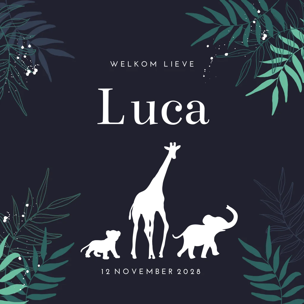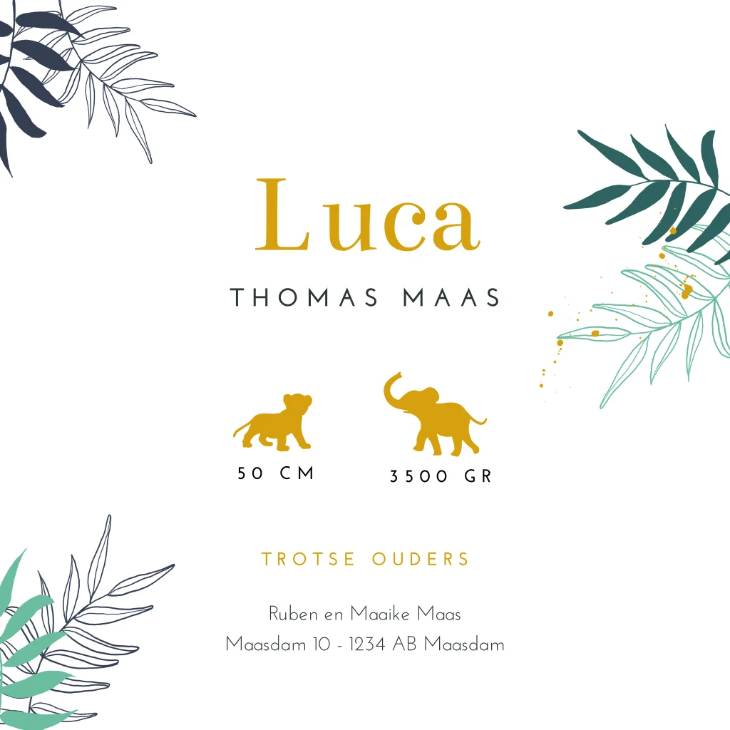 Een avontuurlijk kaartje voor de geboorte van jullie zoontje. Op deze donkerblauwe kaart zijn stijlvolle bladeren aan de zijkanten te zien. In het midden staan een welpje, een girafje en een olifantje. Deze stoere jungledieren worden, net als de naam, gedrukt in echt goudfolie.