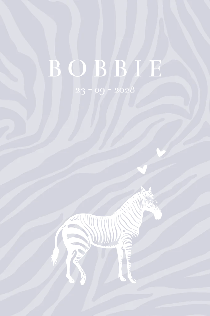 Op de achtergrond van dit geboortekaartje is een lichtblauwe zebraprint te zien. Op de voorgrond staan meerdere elementen in goudfolie. De naam springt er meteen uit en ook de zebra is ontzettend leuk.