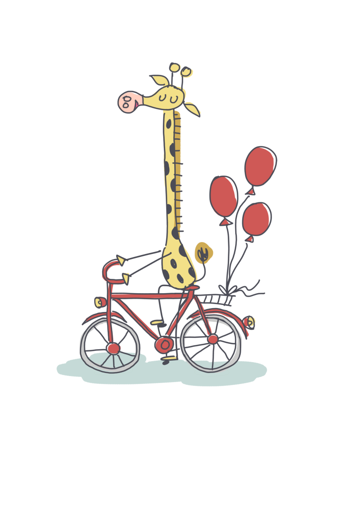 Een stoere giraffe op een rode fiets met achterop 3 rode ballonnen. Een schattige illustratie op een witte achtergrond en de naam in goudfolie.