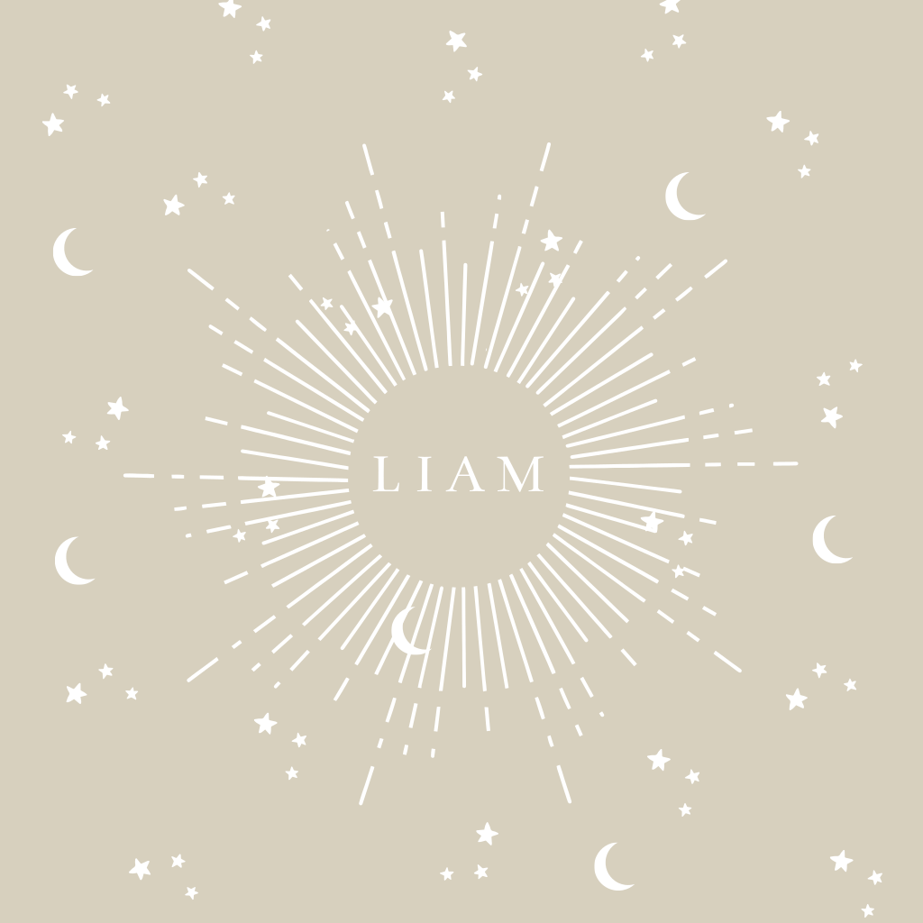 Wat een uniek kaartje voor de geboorte van jullie kleintje! De details van sterretjes en maantjes in het wit zijn erg hip en de zon van goudfolie in het midden van de kaart is ontzettend stijlvol.