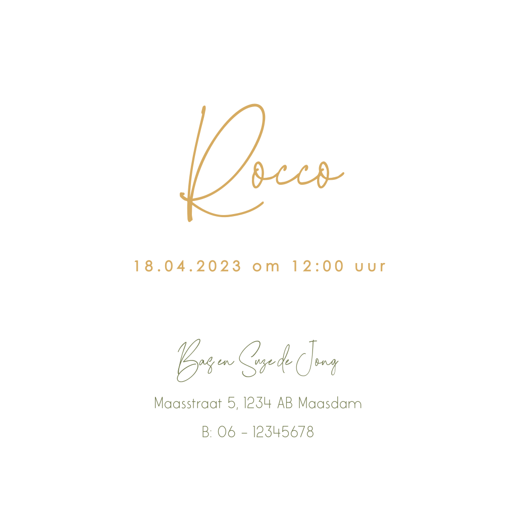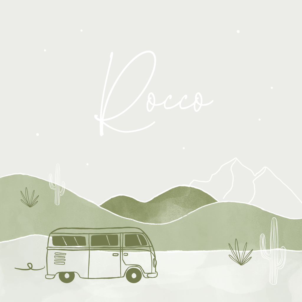 Een stoere en avontuurlijke kaart voor de geboorte van jullie zoontje. Het prachtige landschap op deze kaart is gekleurd in verschillende groentinten. Ook is er een illustratie van een Volkswagenbusje te zien. De naam in het goudfolie trekt meteen alle aandacht.