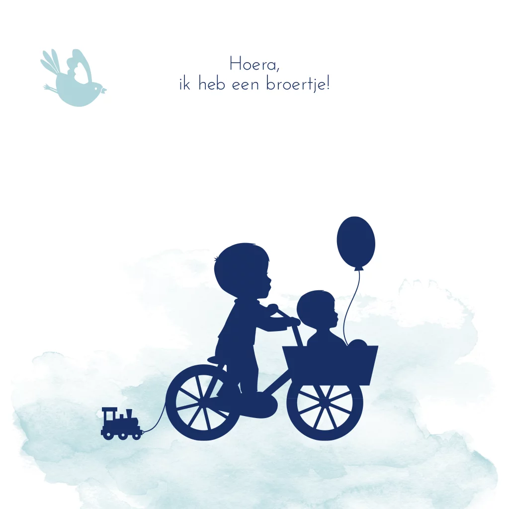 Vierkant geboortekaartje voor een jongen, met blauwe watercolour en een silhouet van een jochie met zijn babybroertje op de fiets. Echt hip! Origineel is dat de naam en het hartje op de voorkant worden gedrukt in luxe goudfolie.