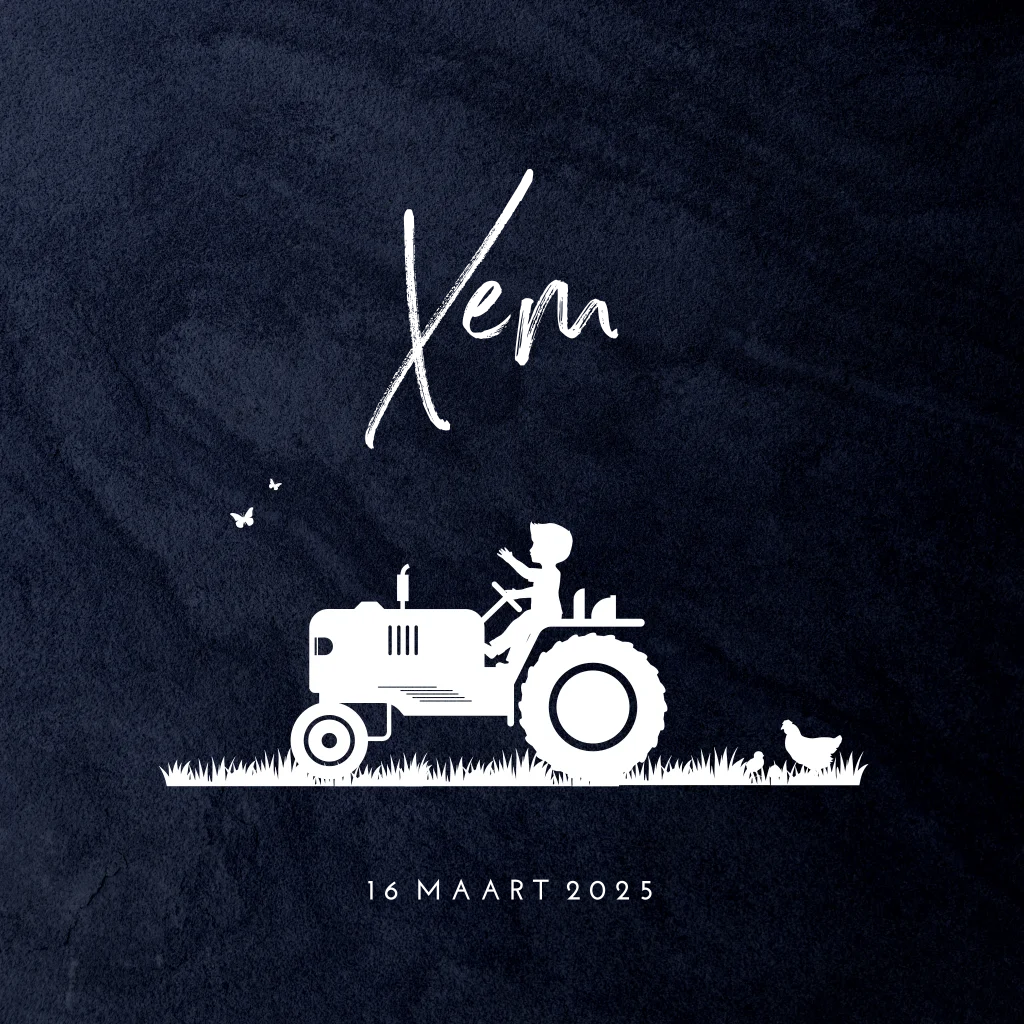 Trendy geboortekaartje voor je zoon met stoer silhouet van een jongetje op de traktor gecombineerd met goudfolie op een hippe donkerblauwe achtergrond.