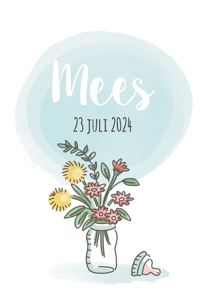 Wat een leuk botanisch geboortekaartje voor een jongen. In een grote blauwe cirkel van watercolour staat de naam in goudfolie. Een getekend boeket wilde bloemen staat in een melkfles. Naast de babyfles ligt de speen. Binnenin vliegt een ooievaar met een mandje met bloemen. Geschikt voor zowel een meisje als jongen.