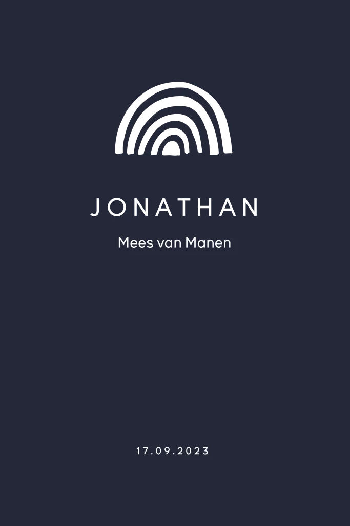 Geboortekaartje voor een jongen met goudfolie naam en regenboog op de voor en achterkant. Regenbogen zijn helemaal in op dit moment. Het donkerblauwe kaartje laat de elementen in goudfolie extra mooi uitkomen. Bestel snel een proefdruk om dit kaartje in het echt te zien!