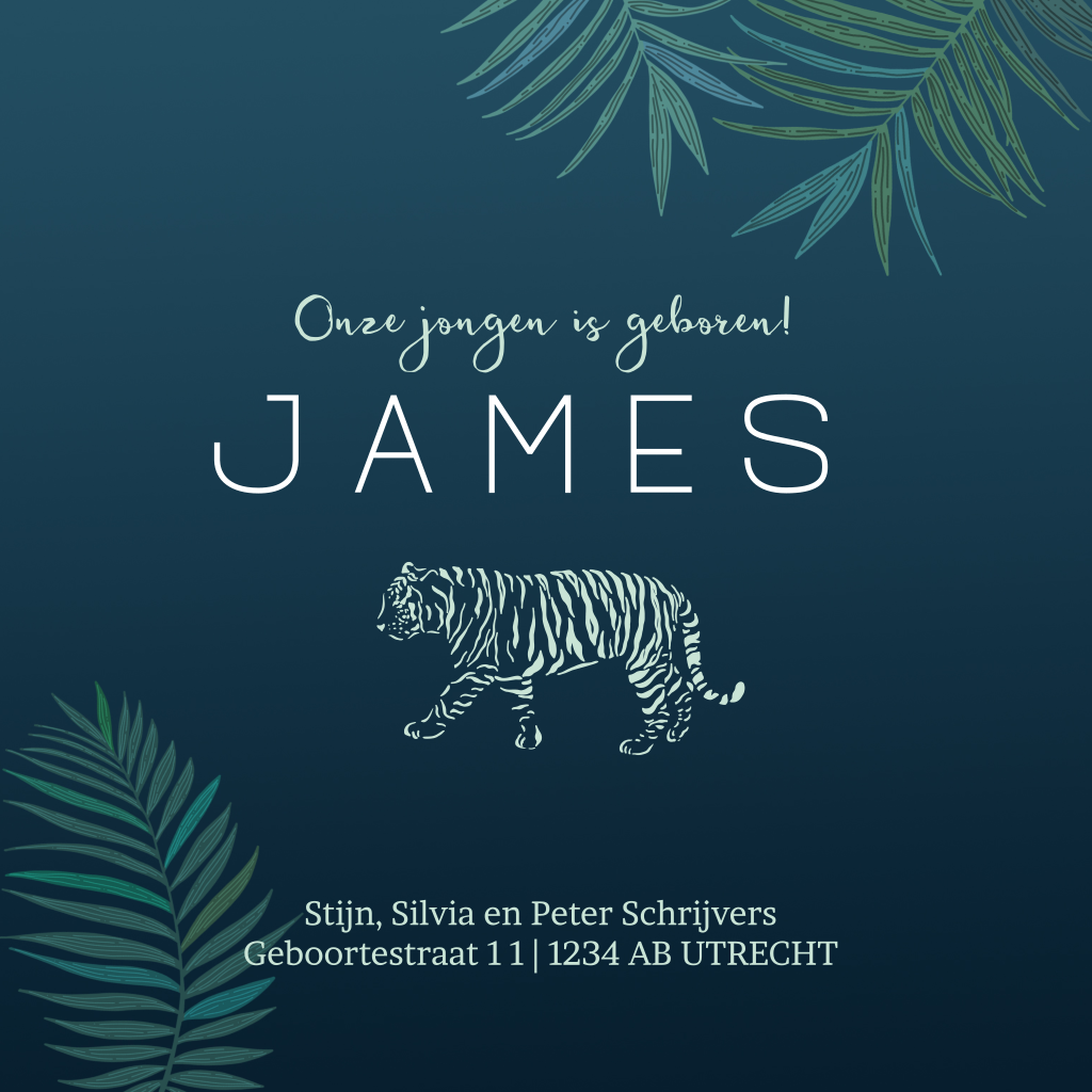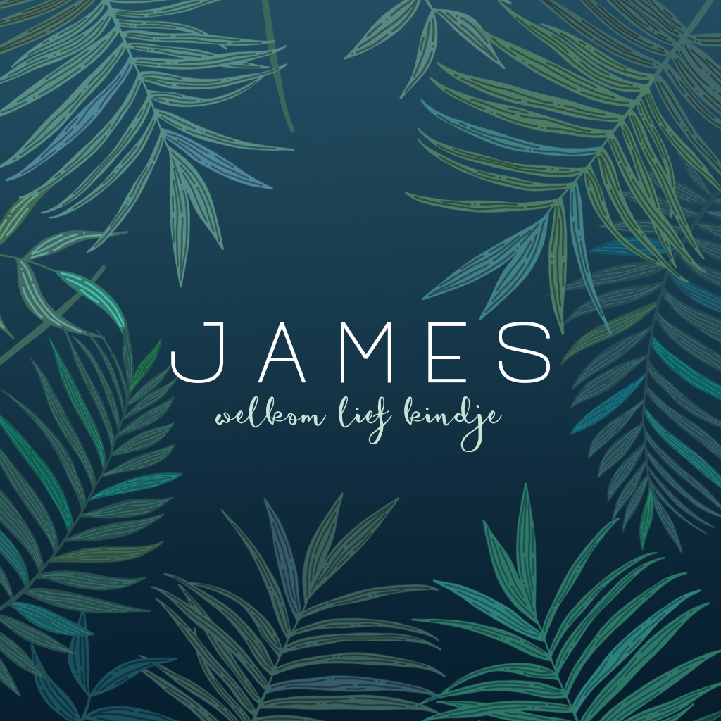 Stijlvol goudfolie geboortekaartje voor de geboorteaankondiging van je zoon. Met hippe botanische jungle bladere op een donkerblauwe achtergrond en de babynaam in goudfolie is dit echt een uniek geboortekaartje!