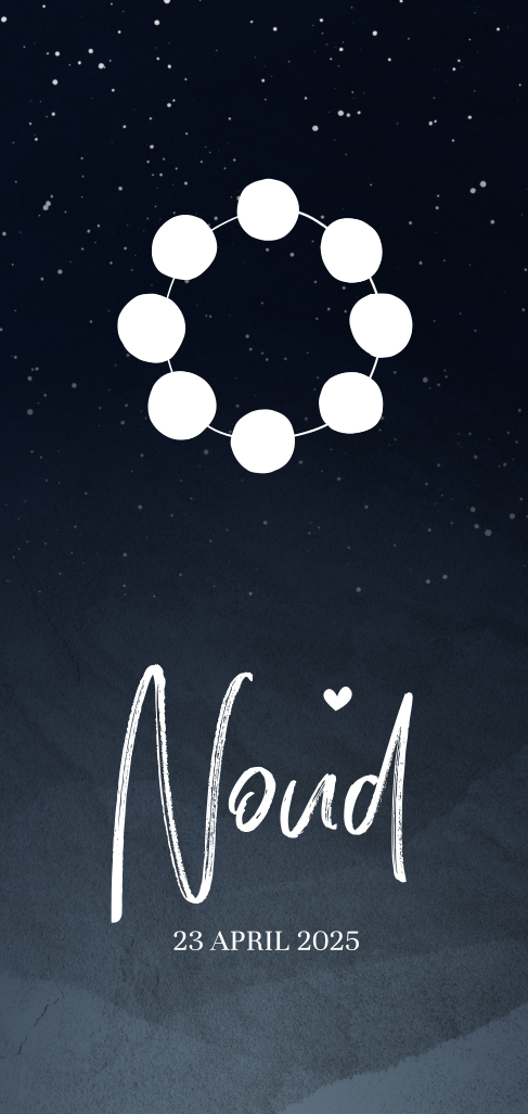 Stoere geboortekaart voor je pasgeboren zoontje met kleine goudfolie maantjes die een geboortemaan voorstellen. Echt een avontuurlijk geboortekaartje!