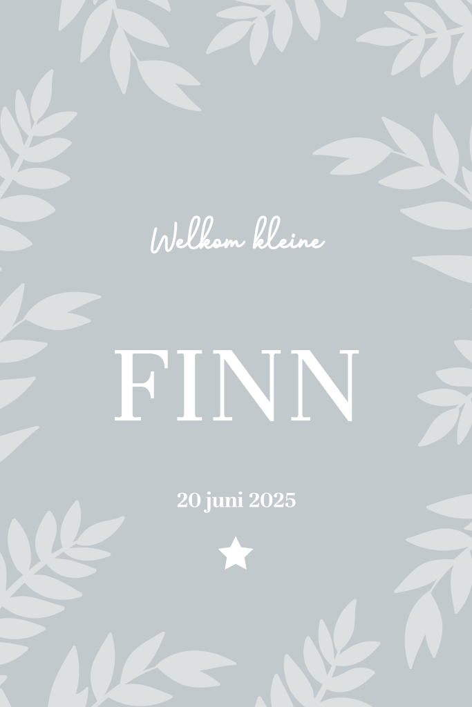 Hip babykaartje met aan de randen de silhouetten van takjes en bladeren op een grijze achtergrond. Centraal staan de naam van je zoontje en een sterretje in goudfolie. Pas de teksten en kleuren van dit kaartje gemakkelijk aan in de online editor.