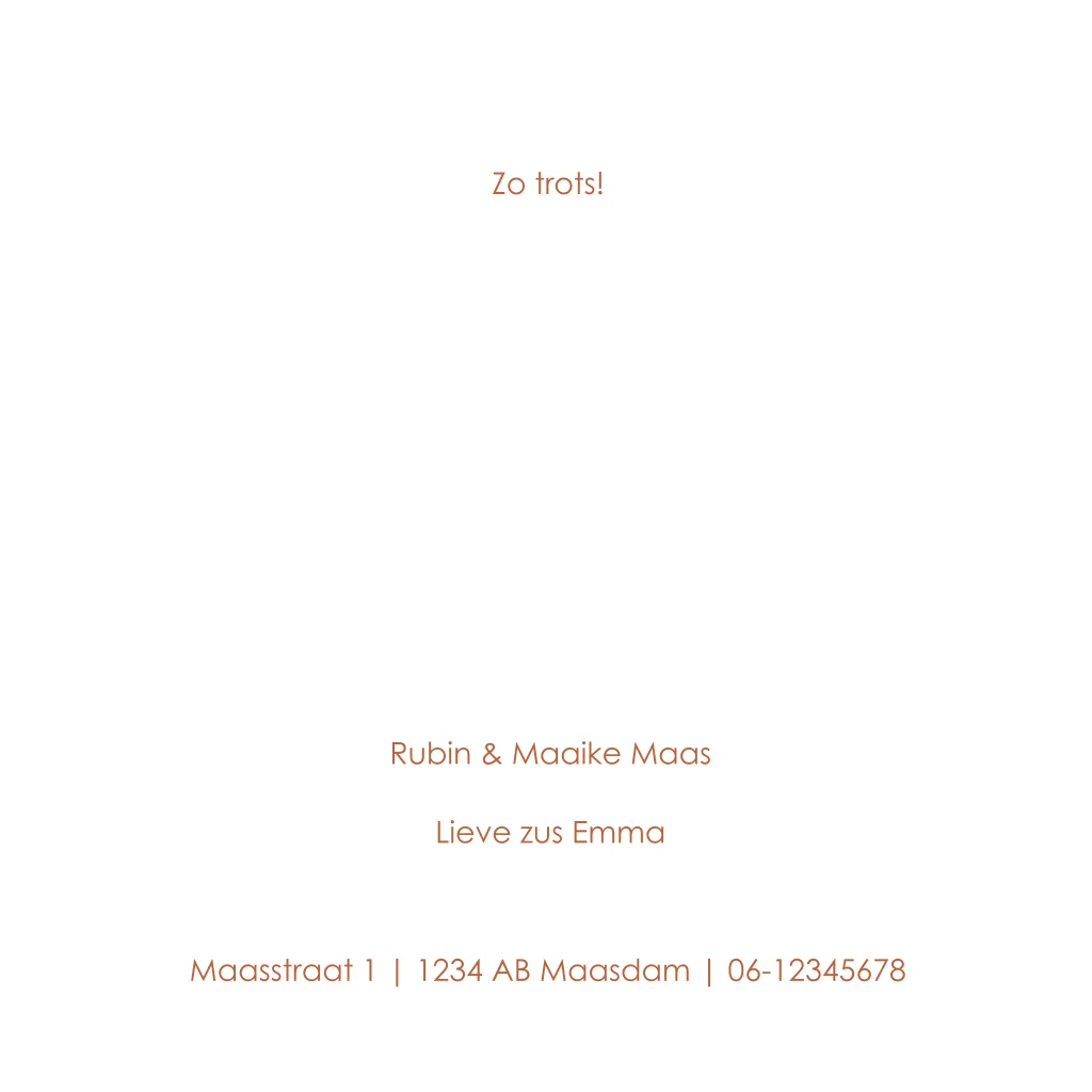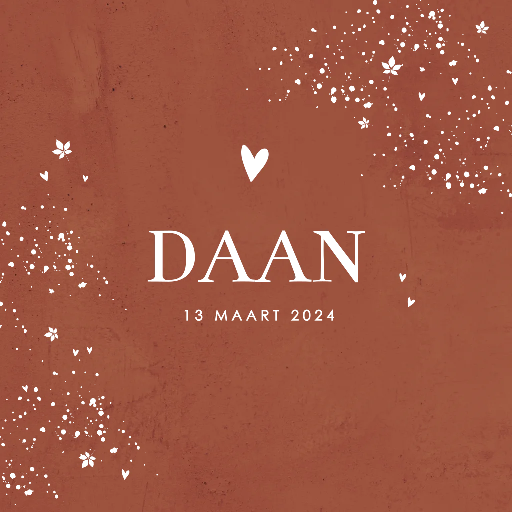 Trendy geboortekaartje met de naam van jullie kindje, verf spetters en een hartje in goudfolie. De achtergrond van het kaartje is warm bruin met verfstrepen.