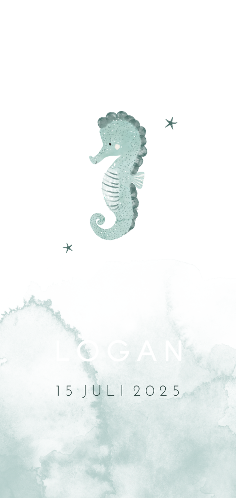 Trendy geboortekaartje met goudfolie voor je pasgeboren zoon met vrolijke illustratie van een zeepaardje met goudfolie details en zeegroene waterverf.