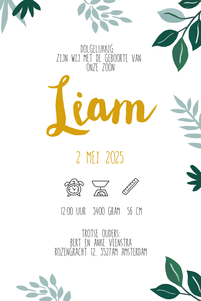Stoer goudfolie geboortekaartje voor jongen met illustratie luipaard