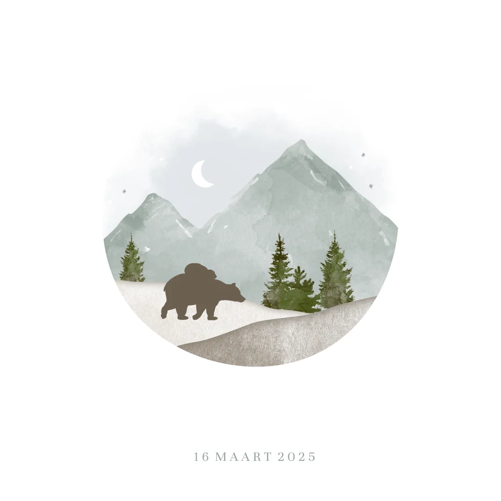 Gebruik dit mooie babykaartje om de geboorte van jullie zoon aan te kondigen. In de cirkel staat een illustratie in waterverf van een grote beer met klein beertje die door de natuur lopen. Op de achtergrond zie je bergen, bomen en de maan. De naam van jullie zoontje en andere elementen zoals het maantje en de sterretjes worden gedrukt in goudfolie.