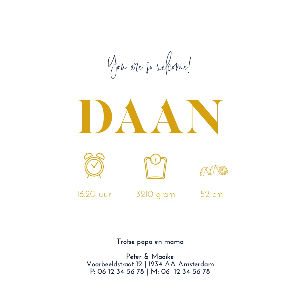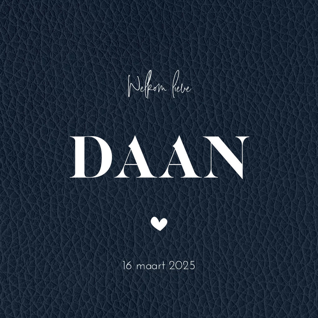 Een stoer kaartje voor de geboorte van jullie zoontje. De achtergrond heeft een donkerblauwe leer-look. De naam staat in een strak lettertype weergegeven en trekt meteen de aandacht. Boven de naam staat een lief hartje.