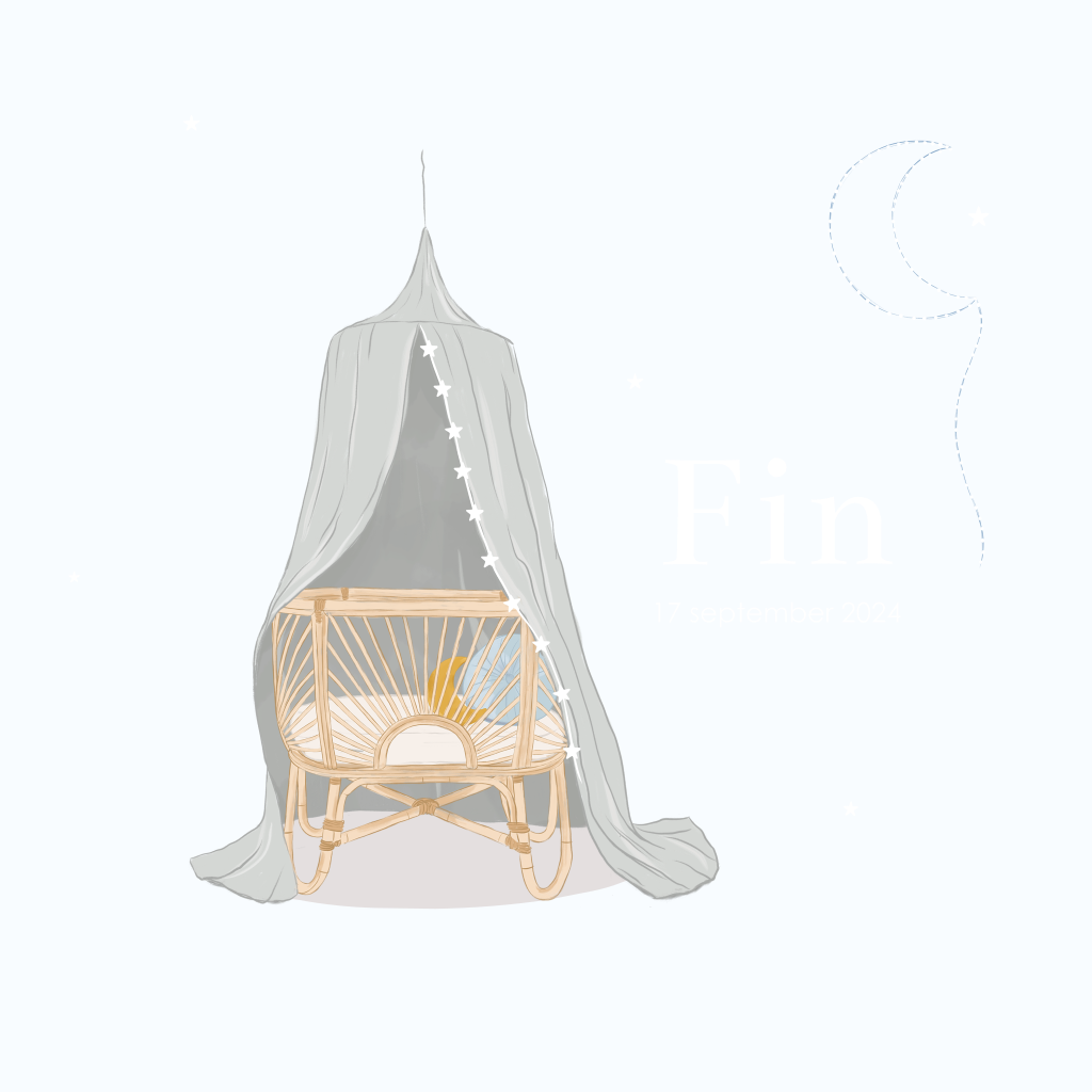 Op zoek naar een uniek geboortekaartje voor de geboorte van je zoon? Op dit lieve kaartje staat de prachtige illustratie van een rotan wiegje. Om de wieg heen staan kleine sterretjes en een ballon in de vorm van een maantje. De gouden details worden gedrukt in goudfolie en maken dit kaartje extra bijzonder!