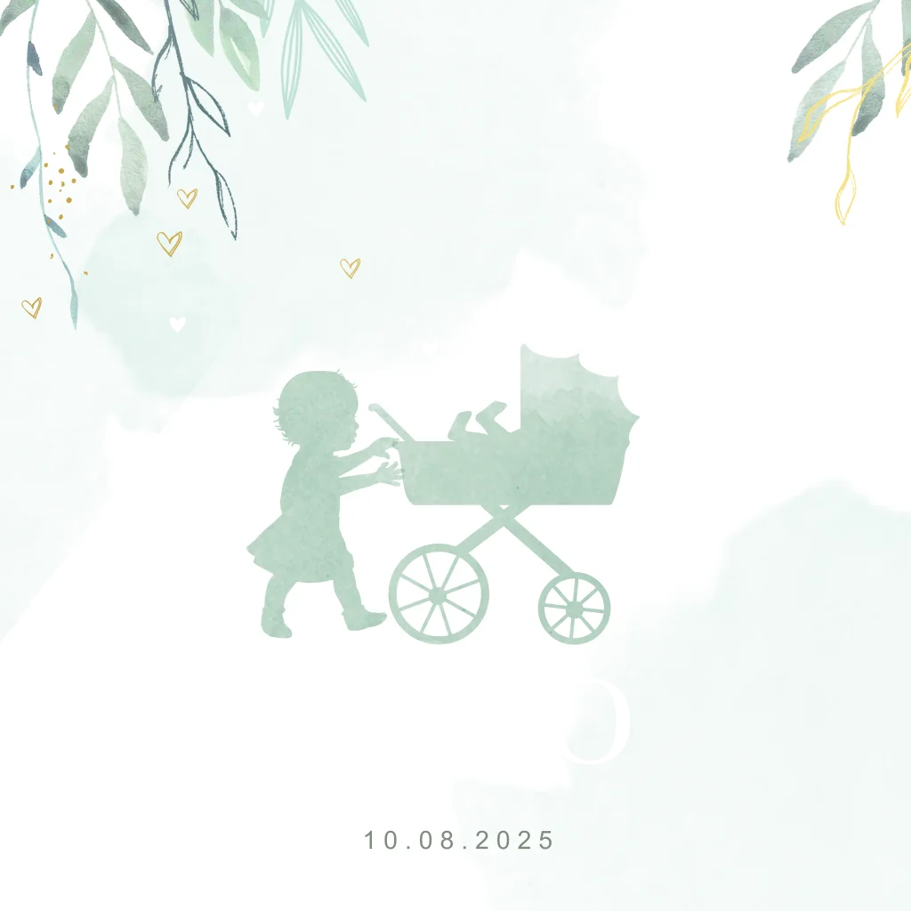 Hip goudfolie geboortekaartje voor de geboorte van je tweede kindje. Met hip silhouet van grote zus die met de kinderwagen loopt waar haar nieuwe baby broertje in licht. De takjes, hartjes en watercolour in frisse voorjaarstinten maken dit een echt leuk lente geboortekaartje!