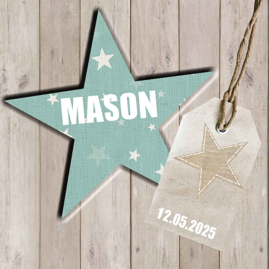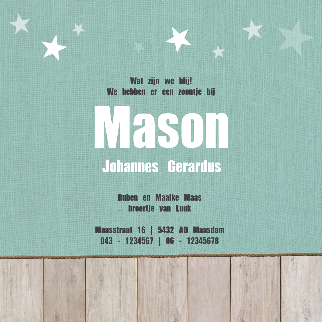 Goudfolie geboortekaartje voor een stoere kleine vent. Met mintgroene sterretjes en een label op een achtergrond van steigerhout en goudfolie details is dit echt een stoer geboortekaartje!