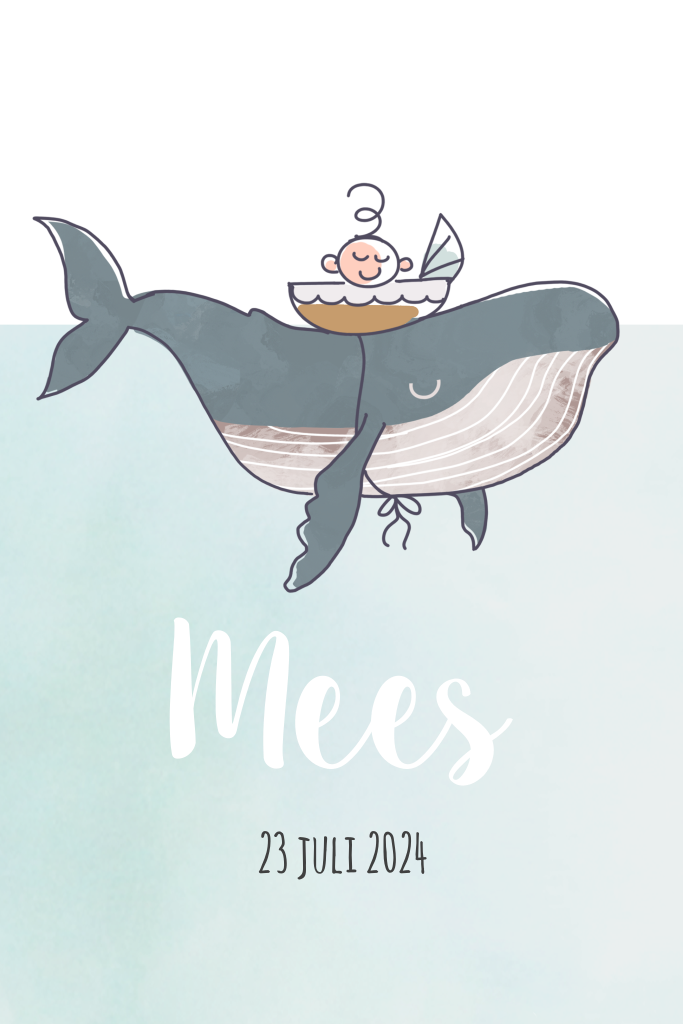 Geboortekaartje met jongen in wieg bovenop een walvis in blauwe zee