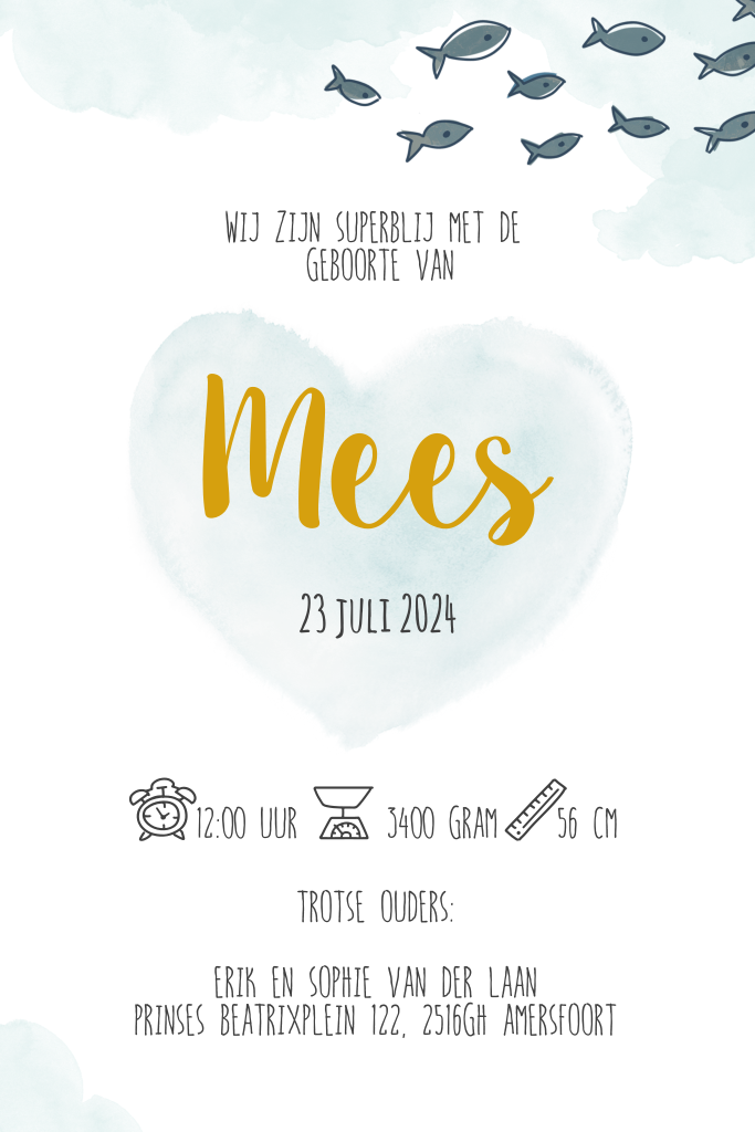 Een lief geboortekaartje met een walvis in een blauwe oceaan. Boven op zijn rug draagt hij een wiegje met daarin een jongen. Er schitteren gouden sterren aan de hemel. In de blauwe zee staat de naam in goudfolie. Binnenin een blauw hart met daarin de naam. De walvis wordt omringd door een hele stoet visjes. Leuk voor een zoon.