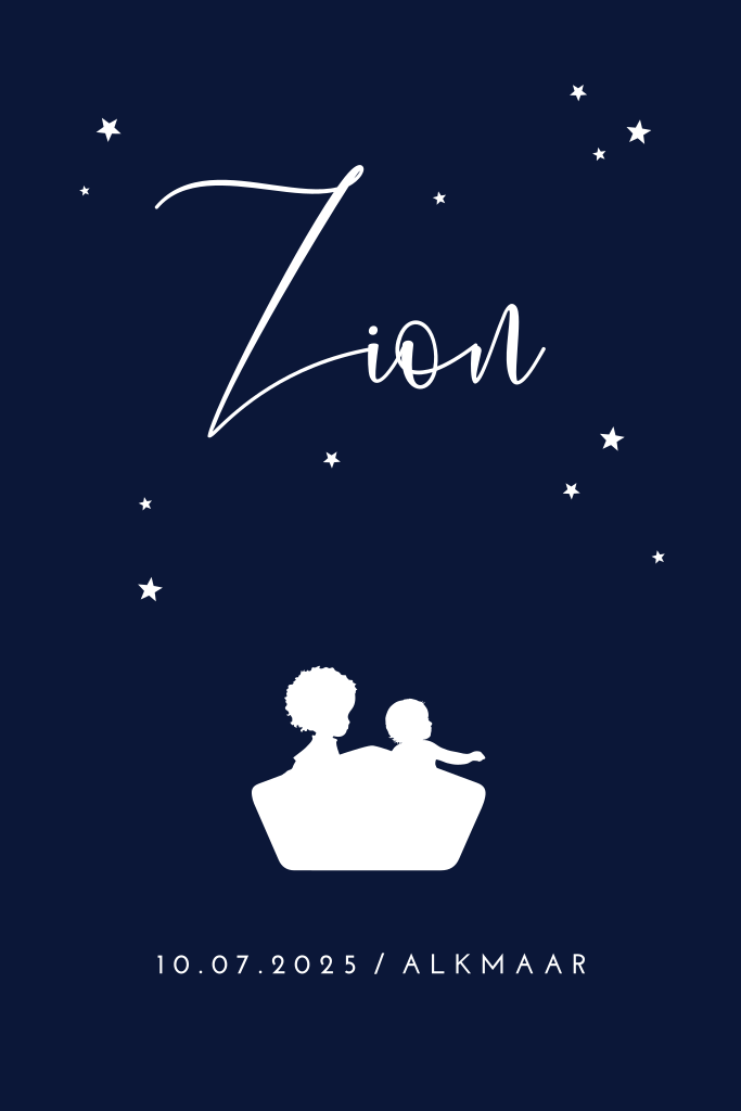 Stijlvol geboortekaartje voor je tweede zoontje met een chique combinatie van goudfolie op een donkerblauwe achtergrond. Op de voorkant staat een silhouet van twee broers die samen in een bootje varen onder de sterrenhemel. Verander de kleuren, lettertypes en teksten en maak zo een unieke geboortekaart!